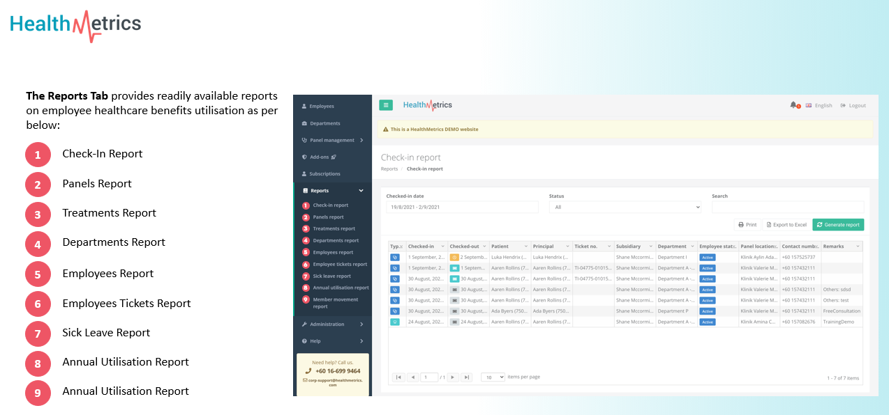 There are 9 different reports available in your HealthMetrics portal for you to View, Find, Export, and Print. Reports generated for your HealthMetrics portal are captured from the day your employees started utilizing HealthMetrics and these data are not editable nor deleted.