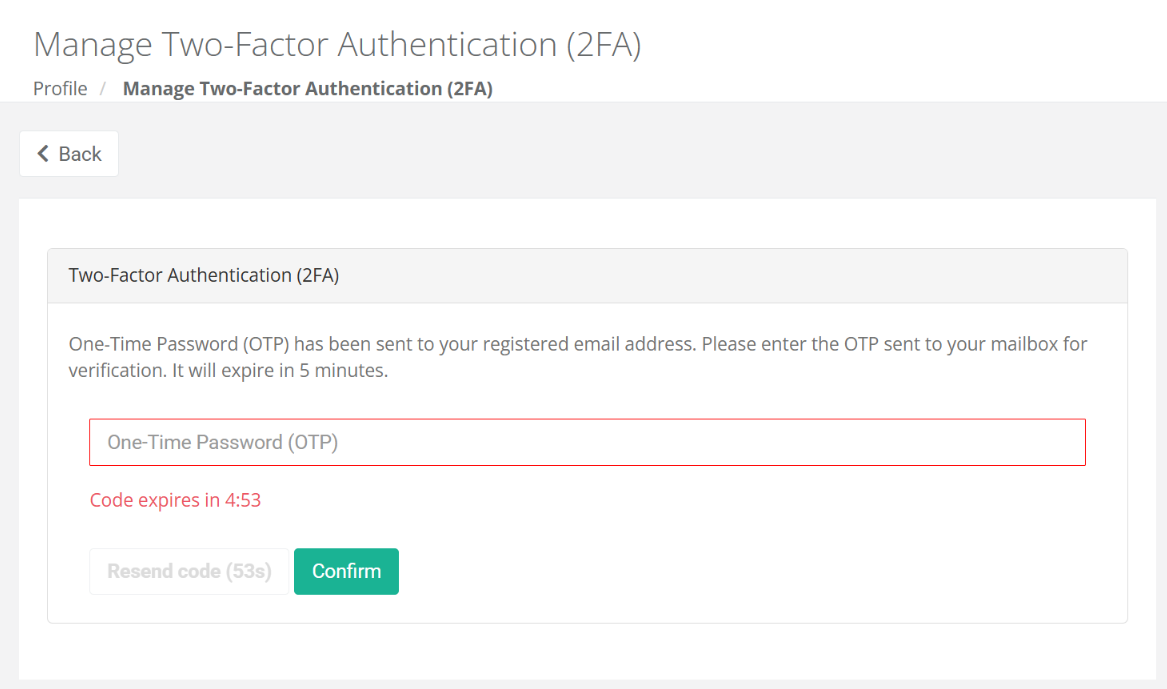 4- OTP will be triggered to your registered email address. Proceed to click the Confirm button after filling in the OTP.