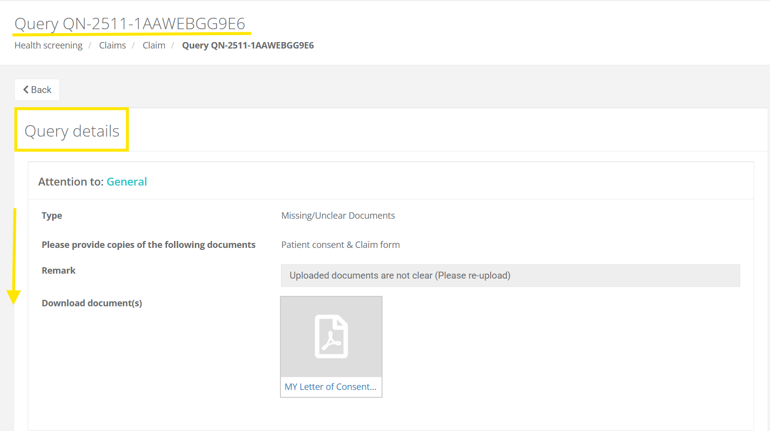 3.) Once you click on the Reply Query button, you will be redirected to the Query Details page. Here, you will see the assigned Query Number along with the full message from the Claims Team.