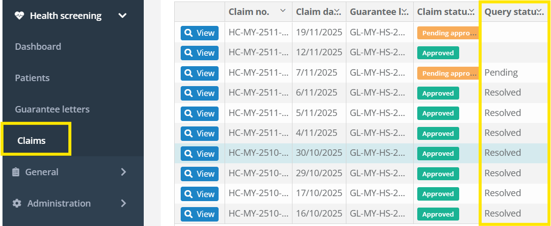 7. Once you have replied to a query, it will no longer appear in the Outstanding window. However, you can always track the status of the query under the Claims tab.