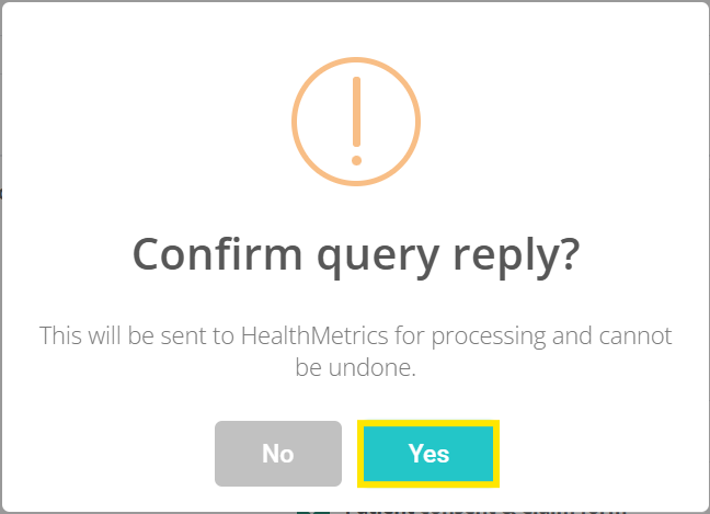 6.) Click Yes to confirm query reply. Do note: This will be sent to HealthMetrics for processing and cannot be undone.