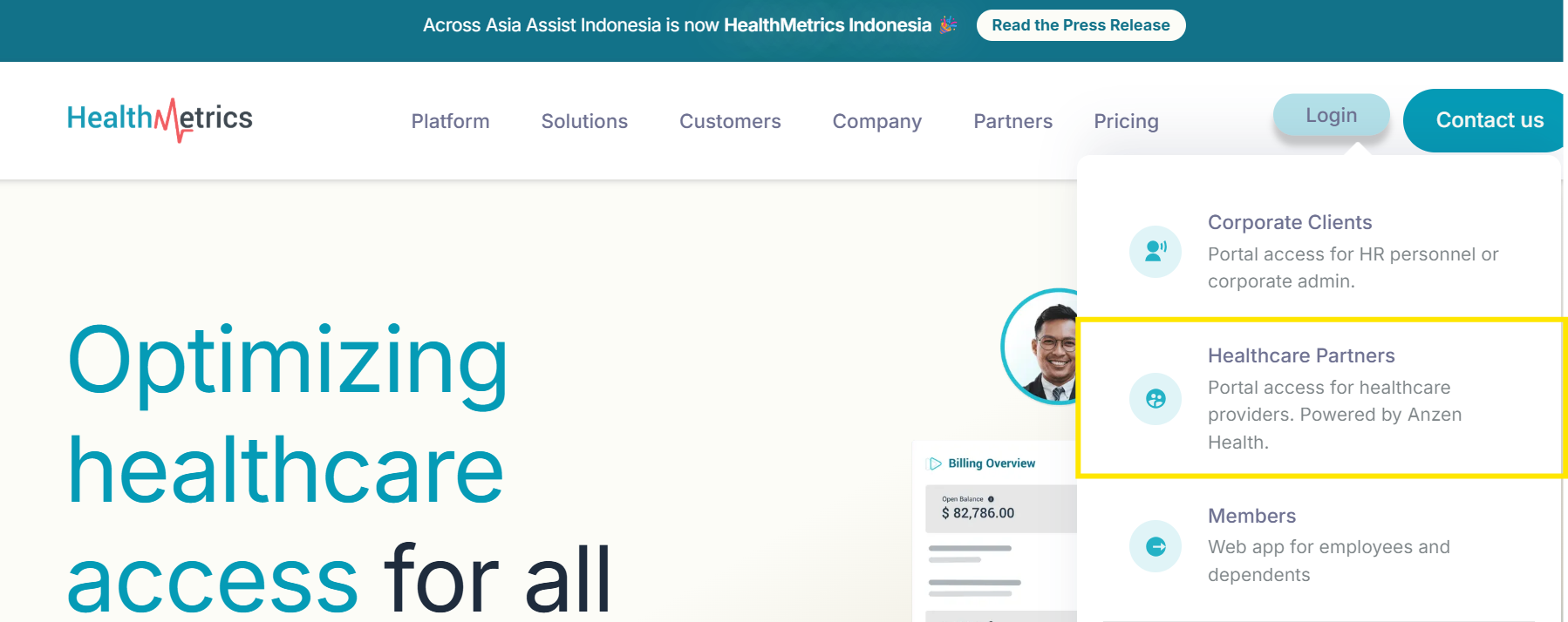 1.) Access the HealthMetrics Portal by logging in to your authorized panel provider account using your credentials. Healthcare Partner