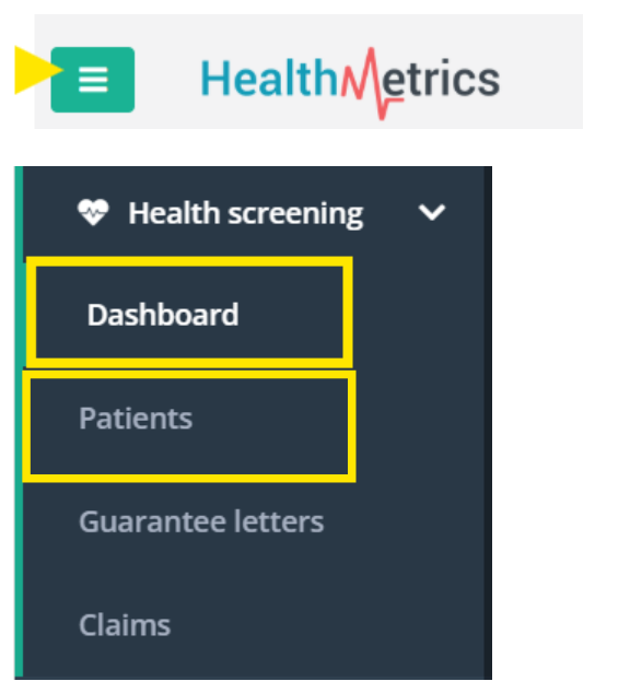 3.) Click the menu toggle at the top left and find the Health Screening Tab. Next, you may request the Guarantee Letter by going to 2 places: A) Dashboard Tab or B) Patients Tab.