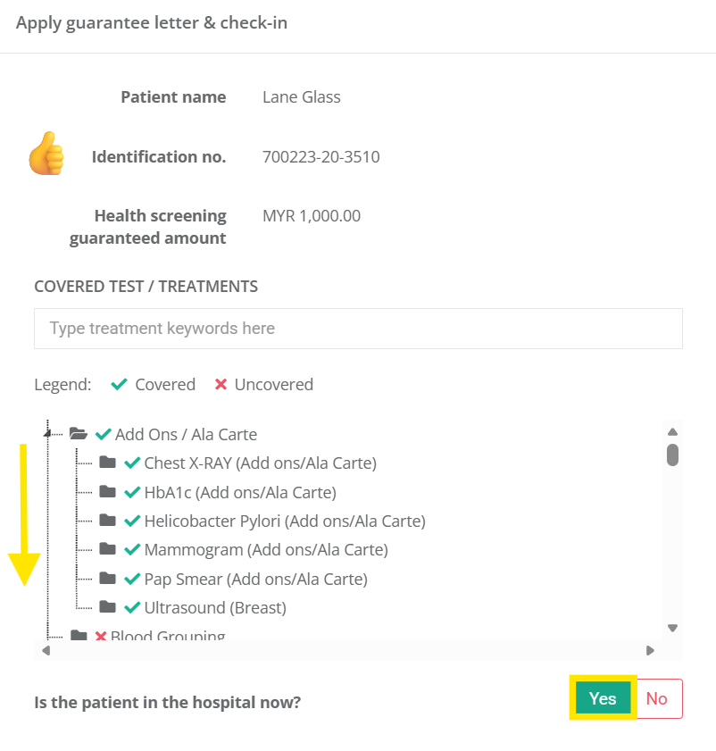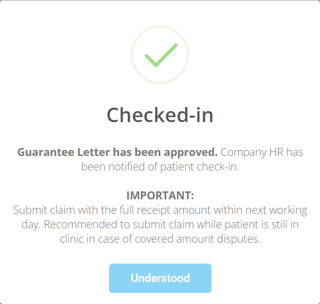 Kindly note that the Guarantee Letter for health screening is automatically approved by the system upon check-in and can only be done by the Hospital Team. No other party is allowed to request it on behalf of the patient.