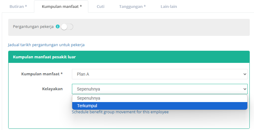 - Pada tab Kumpulan Manfaat, anda akan melihat pilihan Kelayakan ditetapkan kepada Penuh secara lalai. Klik senarai juntai bawah di mana anda akan melihat Terkumpul.