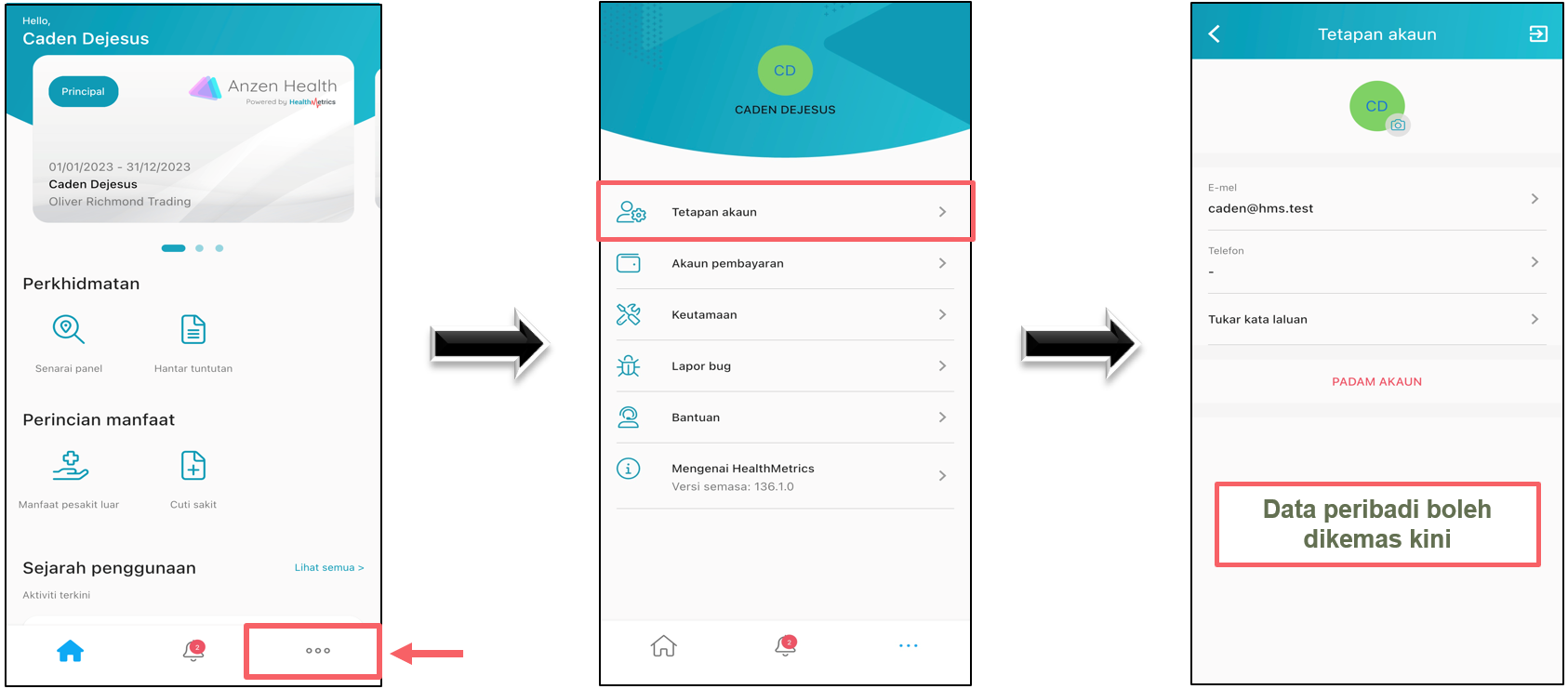 Anda boleh mengemaskini data peribadi anda seperti e-mel, nombor telefon dan juga kata laluan. Data peribadi ini ialah untuk log masuk ke Aplikasi Pekerja HealthMetrics.