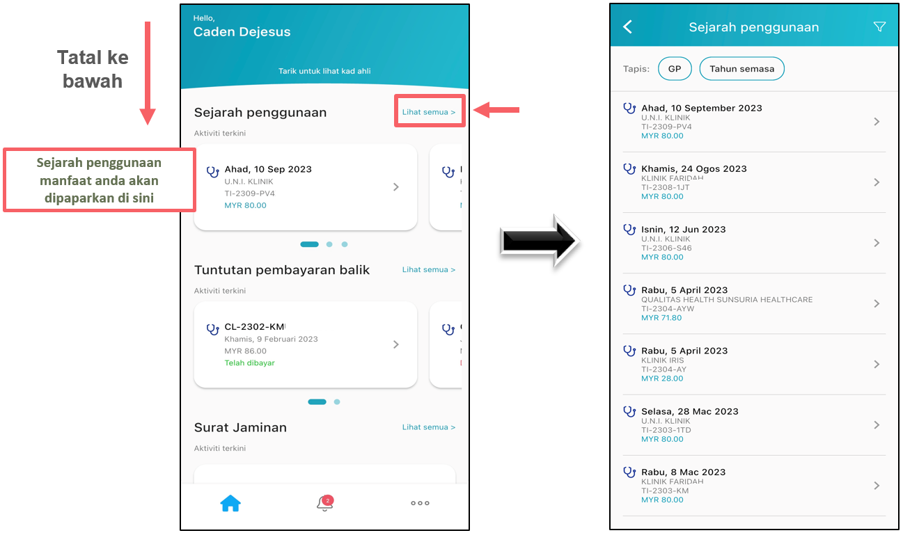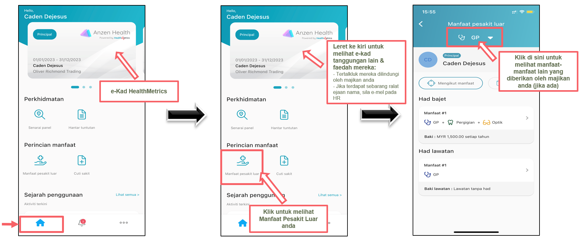 Dari Aplikasi Pekerja HealthMetrics anda, ikuti langkah-langkah di bawah untuk melihat manfaat pesakit luar yang diberikan oleh majikan & sejarah penggunaan anda.