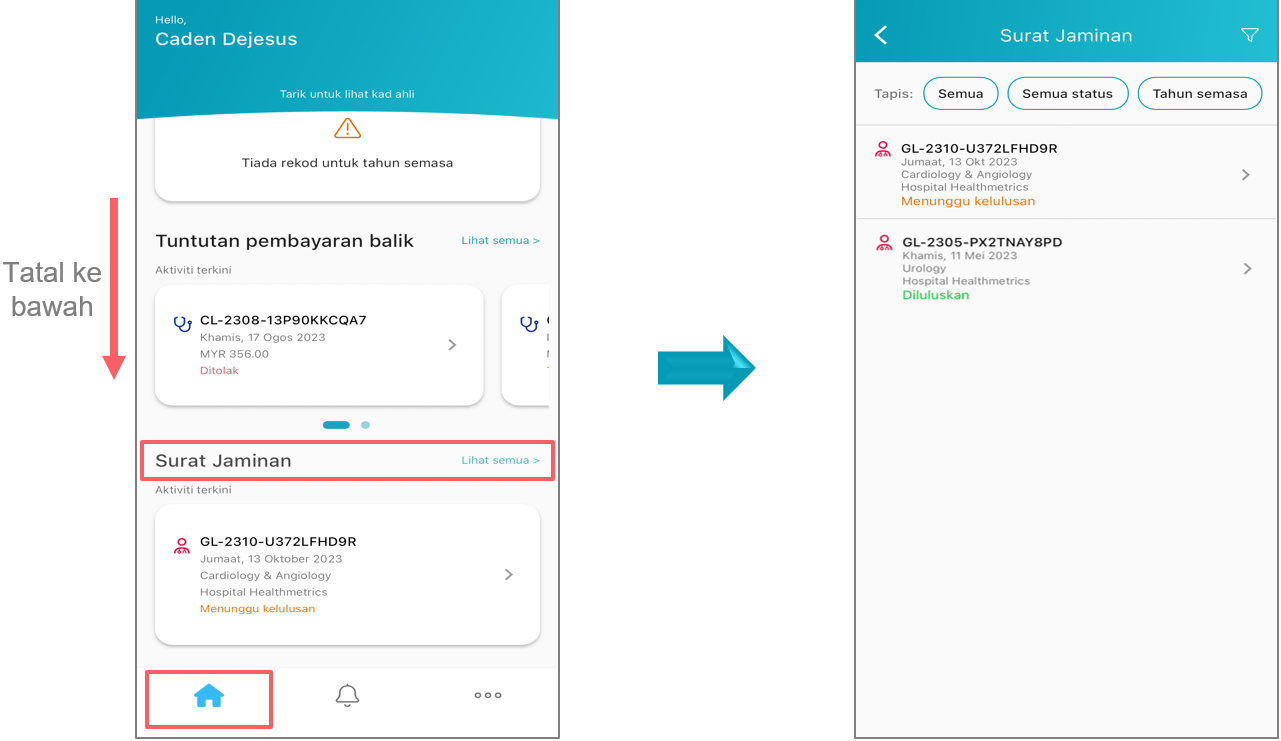 Anda boleh melihat status permohonan Surat Jaminan anda dari Halaman Utama. Hanya tatal ke bawah dan klik pada Lihat semua pilihan pada bahagian Surat Jaminan.